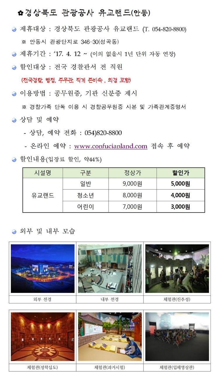 경북 관광공사 유교랜드(안동) - 이용료 할인 (경찰 제휴 할인)