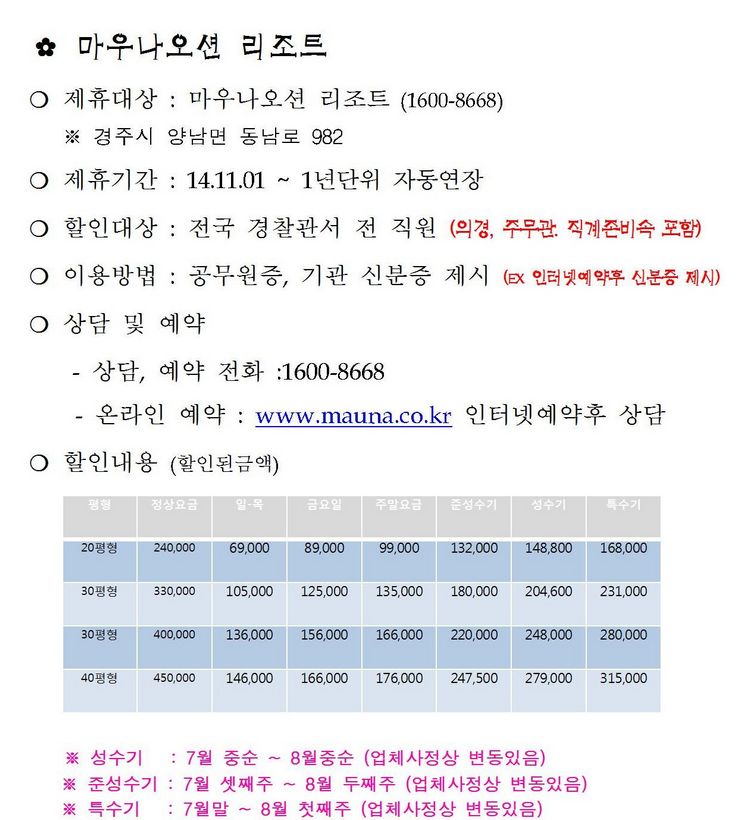경주 마우나오션 리조트 - 이용료 할인 (경찰 제휴 할인) 경주 마우나오션 리조트 숙박 📍 경북 경주시 업체 정보 업체명 경주 마우나오션 리조트 제휴청 경북청 카테고리 숙박 지역 경북 경주시 전화번호 1600-8668 주소 경주시 양남면 동남로 982 제휴혜택 이용료 할인 할인방법 신분증 제시 제휴기간 2014-11-01 ~ 자동연장 상세 소개 💾 첨부이미지 다운로드 (xLKrnPlWjL_20161117162502567000.jpg) 목록으로