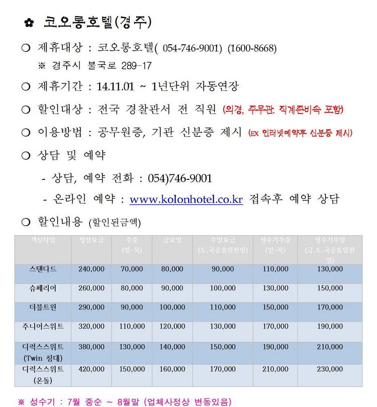 경주 코오롱호텔 - 이용료 할인 (경찰 제휴 할인)