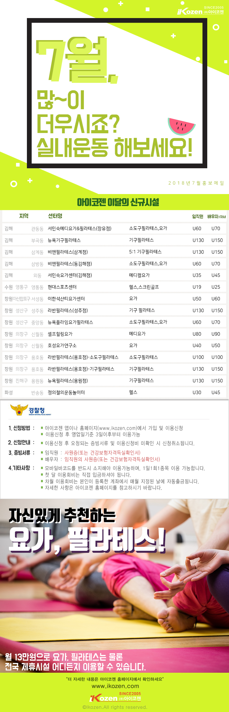 아이코젠 - 신규가입비 면제 (경찰 제휴 할인) 아이코젠 건강(각종 운동) 📍 공통(전국 가맹점) 전국 업체 정보 업체명 아이코젠 제휴청 본청 카테고리 건강(각종 운동) 지역 공통(전국 가맹점) 전국 전화번호 1588-7141 주소 경기도 용인시 기흥구 흥덕1로13 흥덕IT밸리 A동 1707호 제휴혜택 신규가입비 면제 할인방법 경찰청 그룹가입 제휴기간 2018-06-14 ~ 자동연장 상세 소개 💾 첨부파일 다운로드 (전국 제휴스포츠센터표-통합.xls) 💾 첨부이미지 다운로드 (jrapnajWn9_20180704140443111002.jpg) 💾 첨부이미지 다운로드 (jrap0TuNge_20180704140443124003.jpg) 목록으로