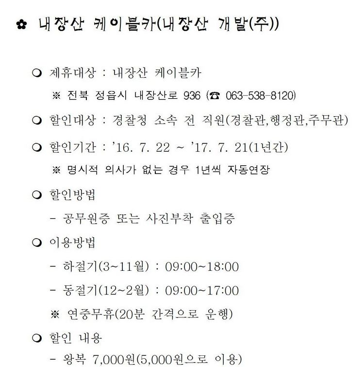 정읍 내장산개발(주) - 케이블카 탑승료 할인(왕복5천원) (경찰 제휴 할인)