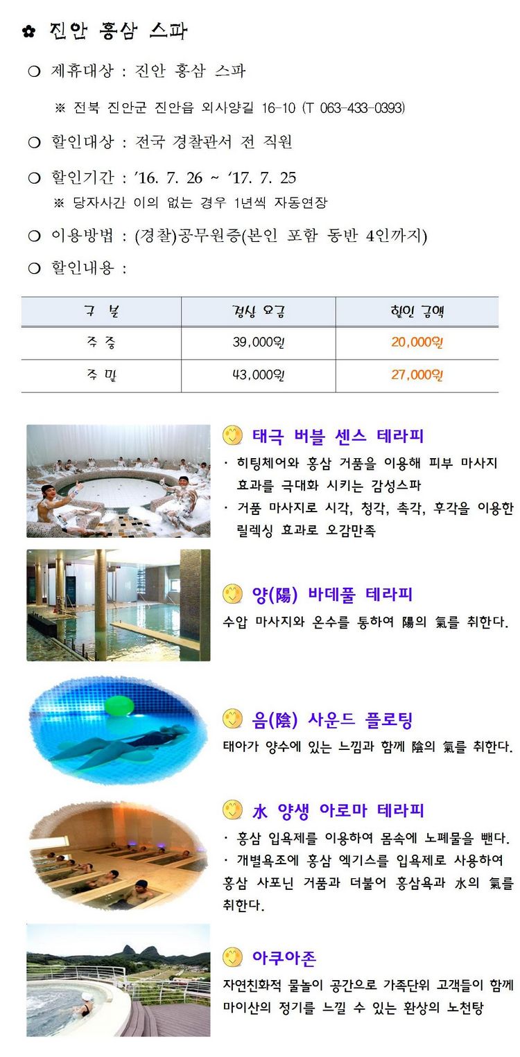 진안 홍삼스파 - 주중20,000원 주말 27000원 (경찰 제휴 할인)